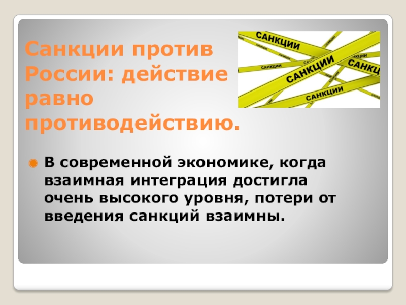 Слайд 21Санкции против России: действие равно противодействию.
