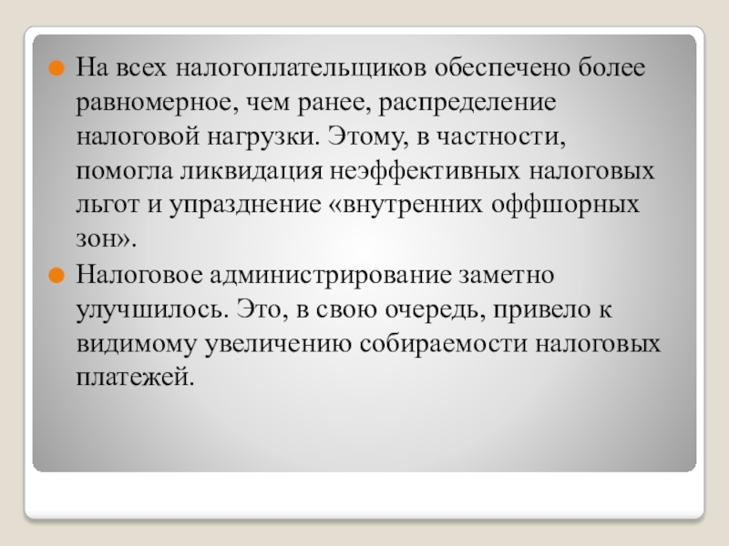Слайд 7На всех налогоплательщиков обеспечено более равномерное, чем ранее, распределение налоговой нагрузки.