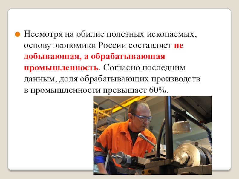 Слайд 20Несмотря на обилие полезных ископаемых, основу экономики России составляет не добывающая,