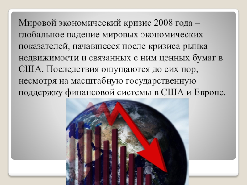 начавшееся после кризиса рынка недвижимости и связанных с ним ценных бумаг в США. Последствия ощущаются до сих пор, несмотря на масштабную государственную поддержку финансовой системы в США и Европе.