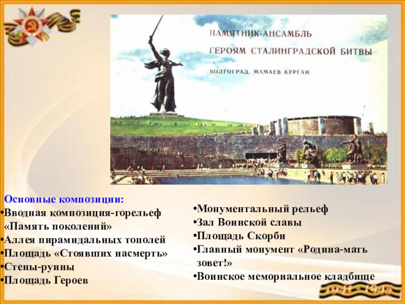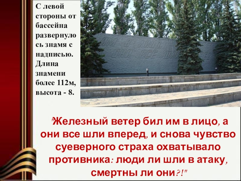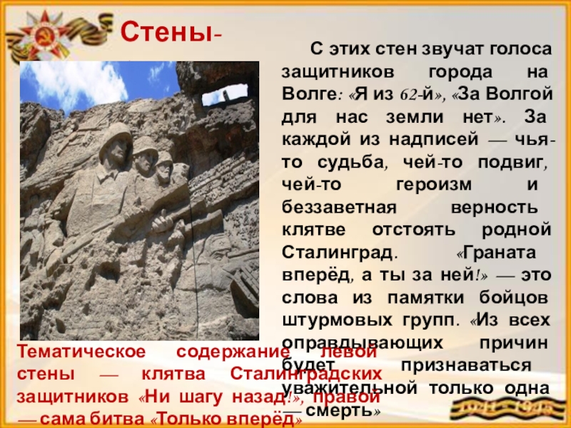 Тематическое содержание левой стены — клятва Сталинградских защитников «Ни шагу назад!», правой — сама битва «Только вперёд»