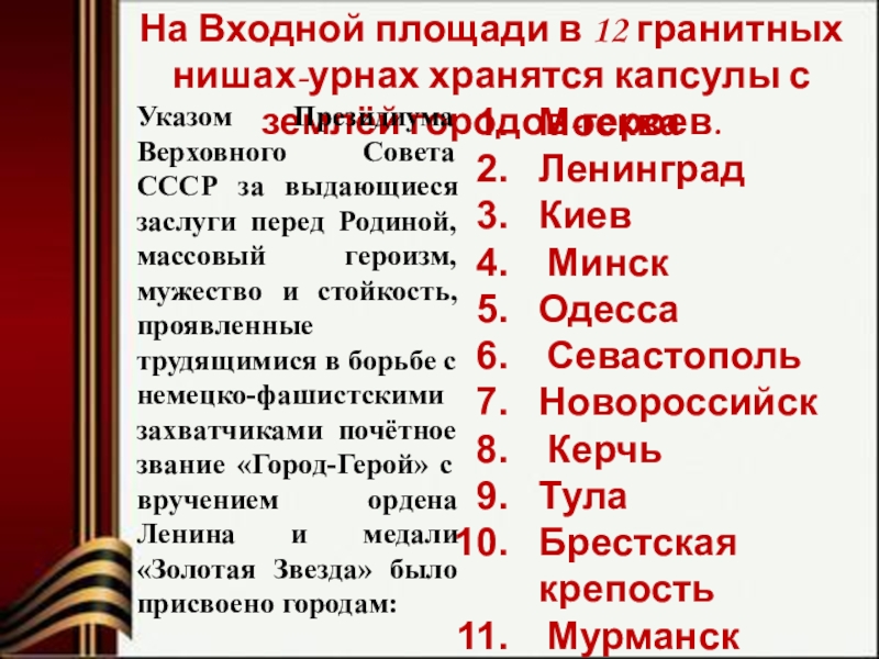 Указом Президиума Верховного Совета СССР за выдающиеся заслуги перед Родиной, массовый героизм, мужество и стойкость, проявленные трудящимися в борьбе с немецко-фашистскими захватчиками почётное звание «Город-Герой» с вручением ордена Ленина и медали «Золотая Звезда» было присвоено городам: