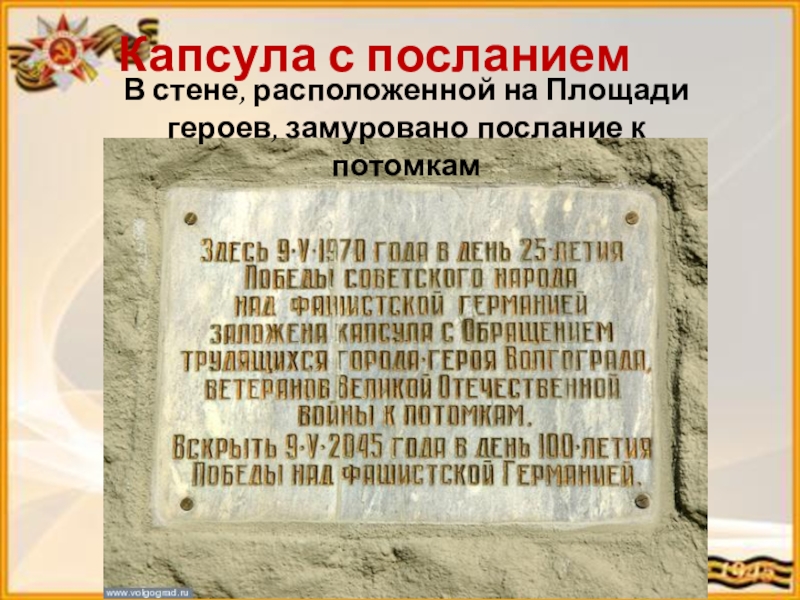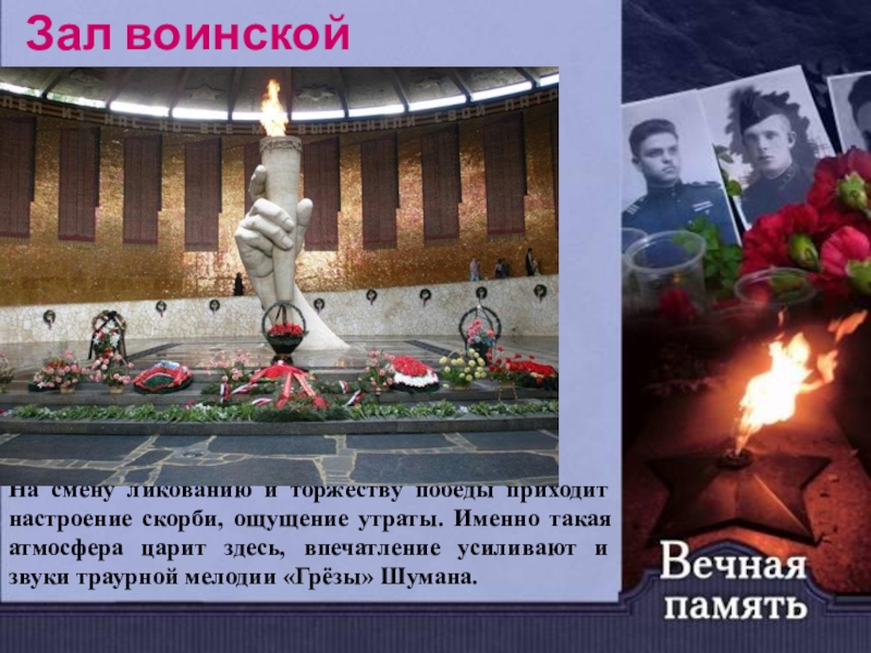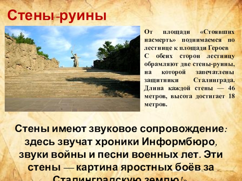 Стены имеют звуковое сопровождение: здесь звучат хроники Информбюро, звуки войны и песни военных лет. Эти стены — картина яростных боёв за Сталинградскую землю!».