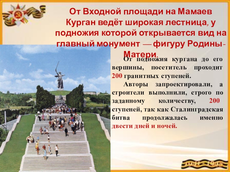 Авторы запроектировали, а строители выполнили, строго по заданному количеству, 200 ступеней, так как Сталинградская битва продолжалась именно двести дней и ночей.