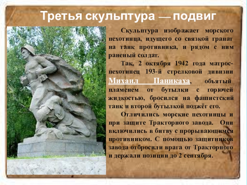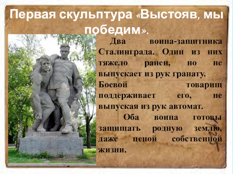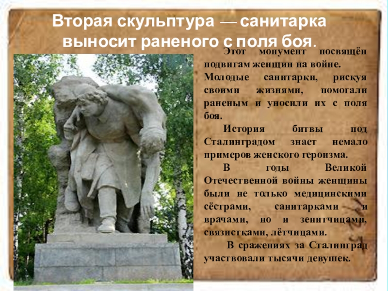 Вторая скульптура — санитарка выносит раненого с поля боя.