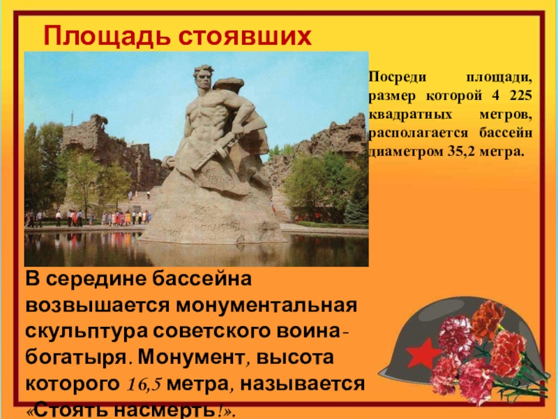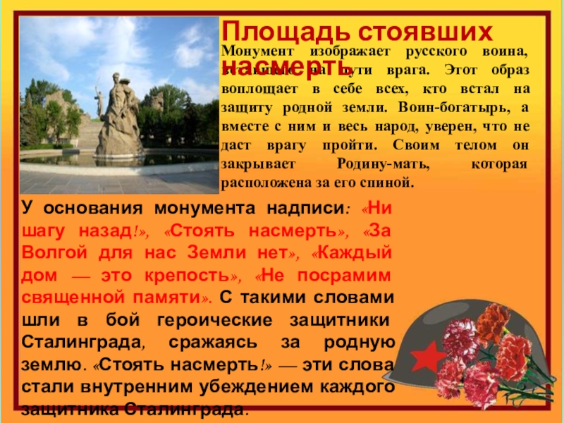 У основания монумента надписи: «Ни шагу назад!», «Стоять насмерть», «За Волгой для нас Земли нет», «Каждый дом — это крепость», «Не посрамим священной памяти». С такими словами шли в бой героические защитники Сталинграда, сражаясь за родную землю. «Стоять насмерть!» — эти слова стали внутренним убеждением каждого защитника Сталинграда.