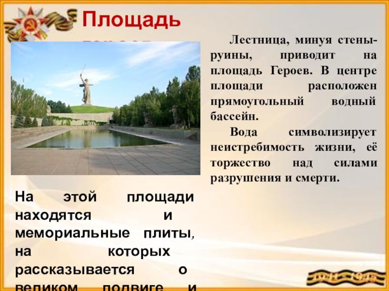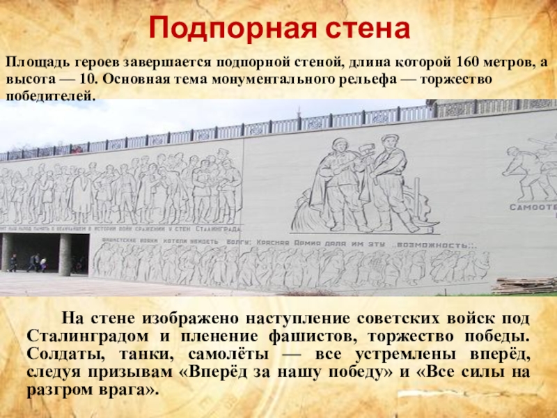 Площадь героев завершается подпорной стеной, длина которой 160 метров, а высота — 10. Основная тема монументального рельефа — торжество победителей.