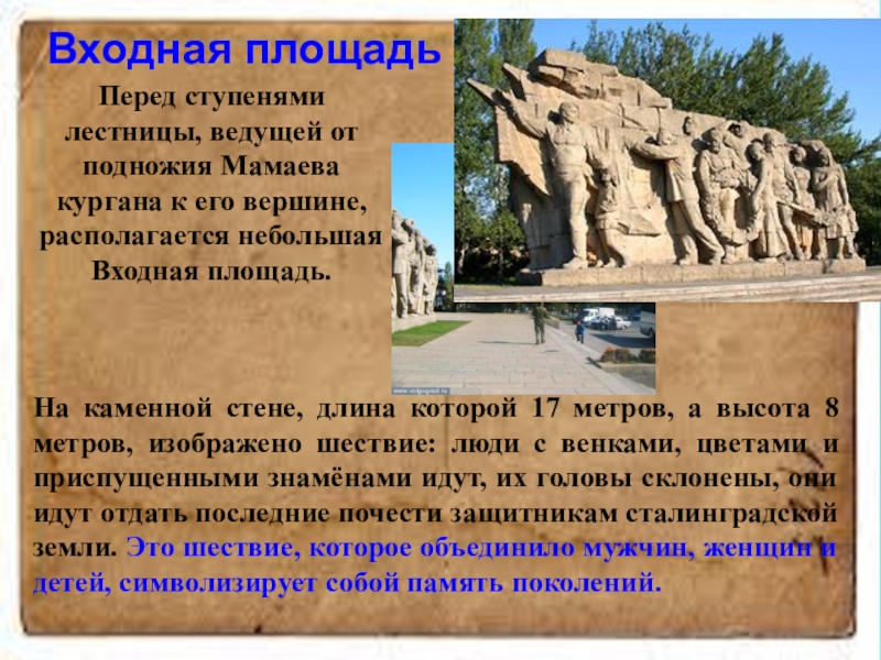 Перед ступенями лестницы, ведущей от подножия Мамаева кургана к его вершине, располагается небольшая Входная площадь.