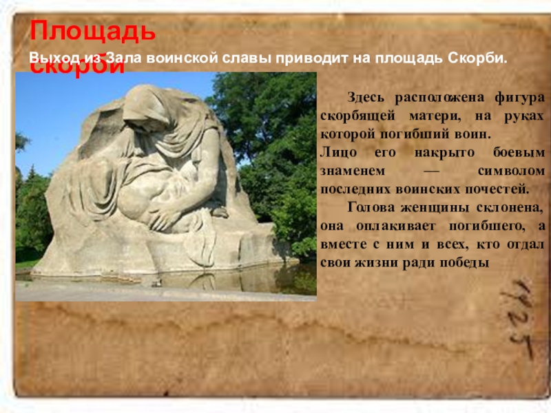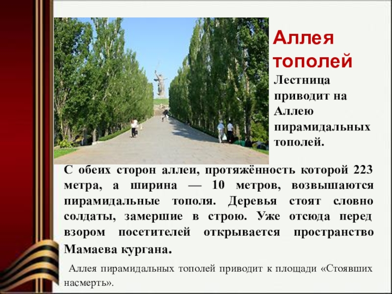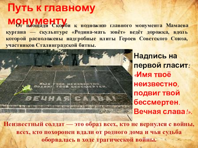 От площади Скорби к подножию главного монумента Мамаева кургана — скульптуре «Родина-мать зовёт» ведёт дорожка, вдоль которой расположены надгробные плиты Героев Советского Союза, участников Сталинградской битвы.