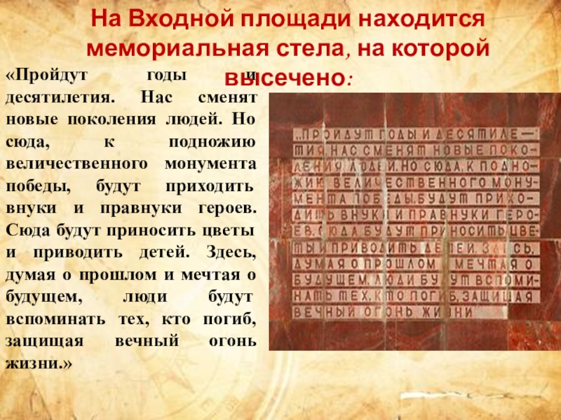 На Входной площади находится мемориальная стела, на которой высечено: