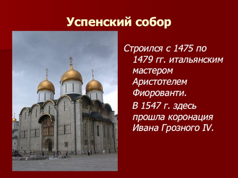 Успенский собор Строился с 1475 по 1479 гг. итальянским мастером Аристотелем Фиорованти.  В 1547 г. здесь