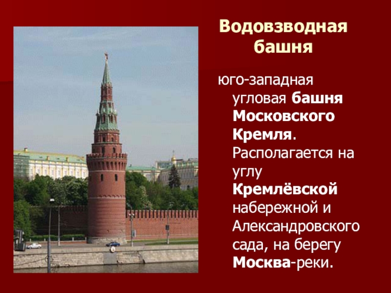 Водовзводная башняюго-западная угловая башня Московского Кремля. Располагается на углу Кремлёвской набережной и Александровского сада, на берегу Москва-реки.