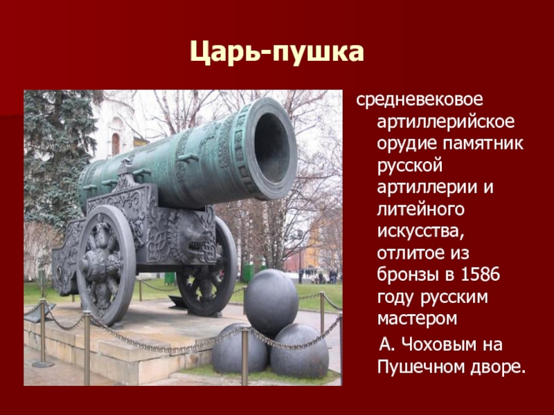 Царь-пушкасредневековое артиллерийское орудие памятник русской артиллерии и литейного искусства, отлитое из бронзы в 1586 году русским мастером