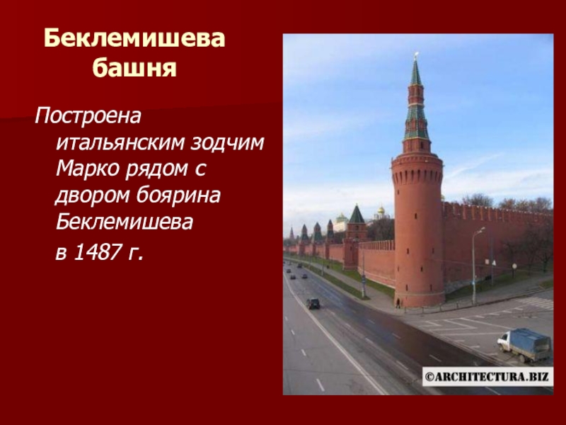 Беклемишева башняПостроена итальянским зодчим Марко рядом с двором боярина Беклемишева  в 1487 г.