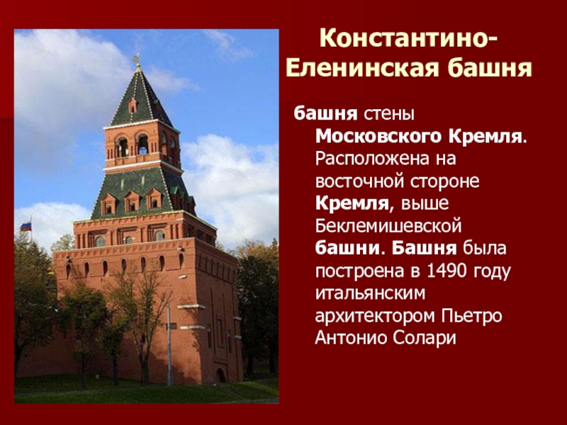Константино-Еленинская башнябашня стены Московского Кремля. Расположена на восточной стороне Кремля, выше Беклемишевской башни. Башня была построена в