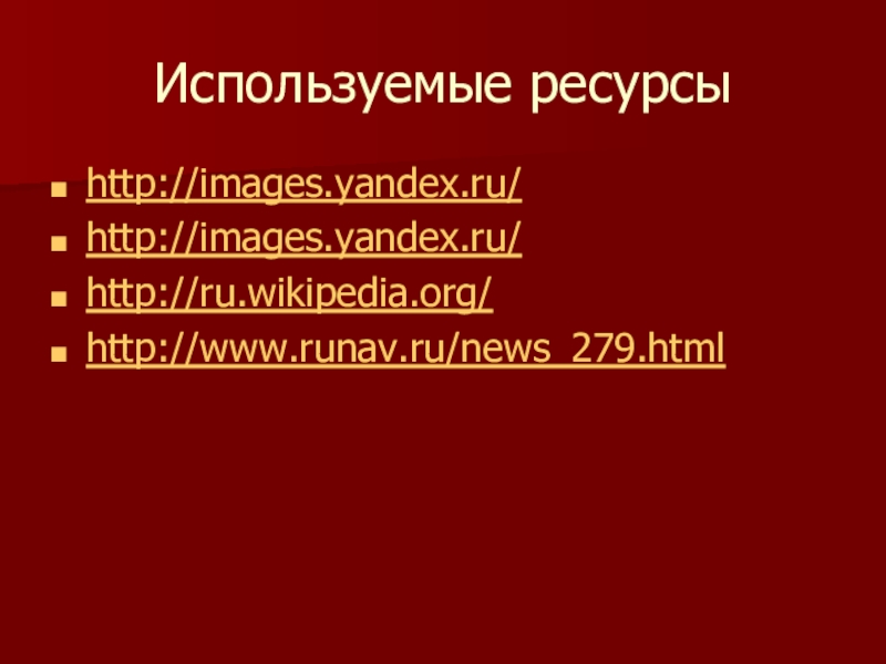 Используемые ресурсыhttp://images.yandex.ru/http://images.yandex.ru/http://ru.wikipedia.org/http://www.runav.ru/news_279.html