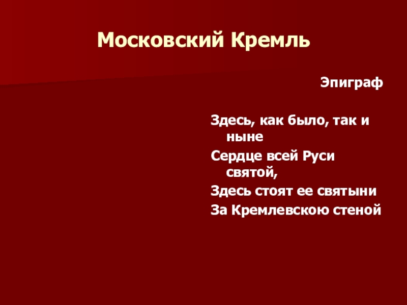 Московский Кремль Эпиграф Здесь, как было, так и нынеСердце всей Руси святой,Здесь стоят ее святыниЗа Кремлевскою стеной