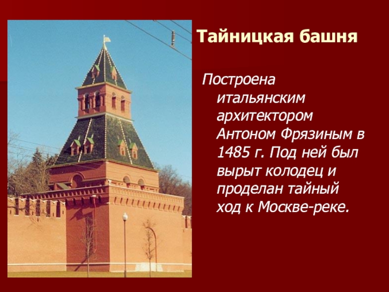 Тайницкая башняПостроена итальянским архитектором Антоном Фрязиным в 1485 г. Под ней был вырыт колодец и проделан тайный