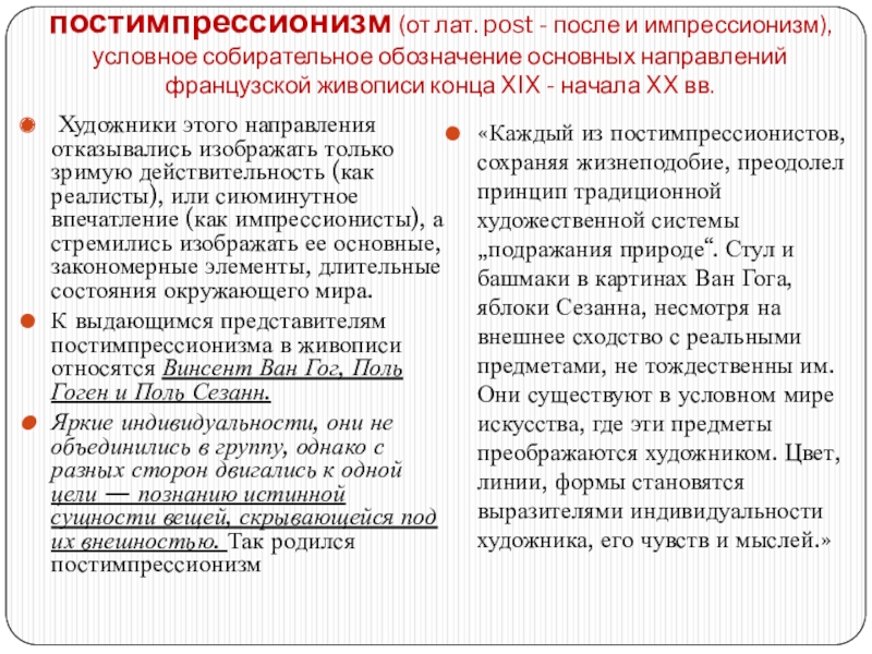 «Каждый из постимпрессионистов, сохраняя жизнеподобие, преодолел принцип традиционной художественной системы „подражания природе“. Стул и башмаки в картинах Ван Гога, яблоки Сезанна, несмотря на внешнее сходство с реальными предметами, не тождественны им. Они существуют в условном мире искусства, где эти предметы преображаются художником. Цвет, линии, формы становятся выразителями индивидуальности художника, его чувств и мыслей.»