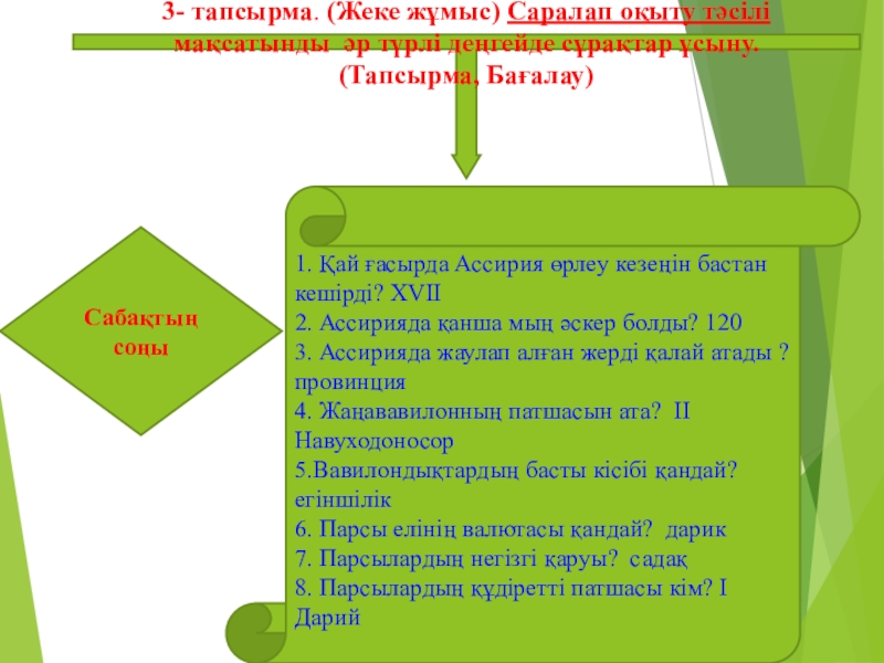 - Ассирия мемлекеттінің жүргізген басқыншылық жорықтардың нәтижелерін атайды.