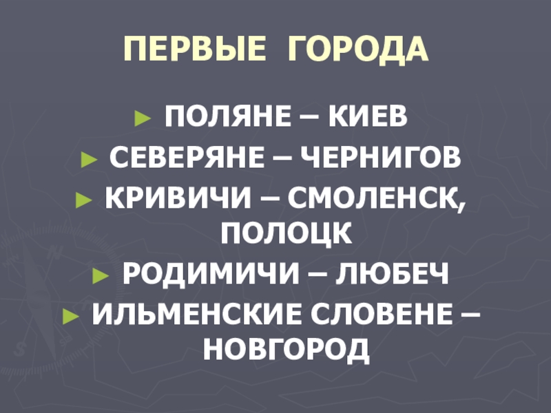 ПЕРВЫЕ ГОРОДАПОЛЯНЕ – КИЕВ СЕВЕРЯНЕ – ЧЕРНИГОВ КРИВИЧИ – СМОЛЕНСК, ПОЛОЦКРОДИМИЧИ – ЛЮБЕЧ ИЛЬМЕНСКИЕ СЛОВЕНЕ – НОВГОРОД