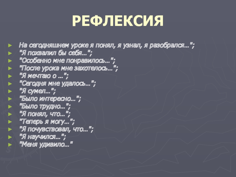 РЕФЛЕКСИЯНа сегодняшнем уроке я понял, я узнал, я разобрался…
