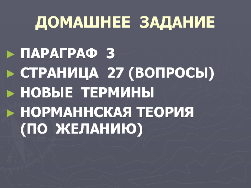ДОМАШНЕЕ ЗАДАНИЕПАРАГРАФ 3СТРАНИЦА 27 (ВОПРОСЫ)НОВЫЕ ТЕРМИНЫНОРМАННСКАЯ ТЕОРИЯ   (ПО ЖЕЛАНИЮ)