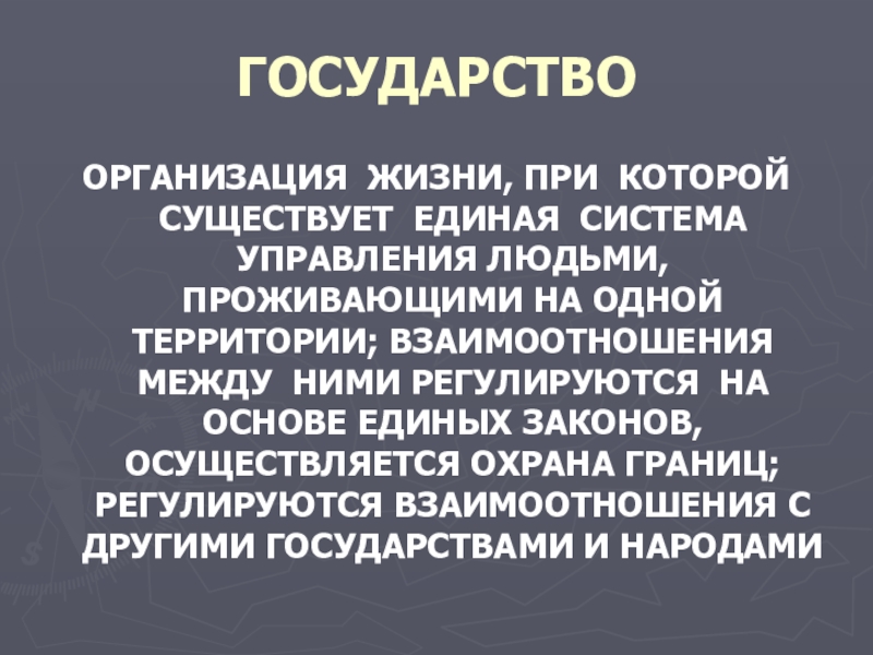 ГОСУДАРСТВООРГАНИЗАЦИЯ ЖИЗНИ, ПРИ КОТОРОЙ СУЩЕСТВУЕТ ЕДИНАЯ СИСТЕМА УПРАВЛЕНИЯ ЛЮДЬМИ, ПРОЖИВАЮЩИМИ НА ОДНОЙ ТЕРРИТОРИИ; ВЗАИМООТНОШЕНИЯ МЕЖДУ НИМИ РЕГУЛИРУЮТСЯ НА ОСНОВЕ ЕДИНЫХ ЗАКОНОВ, ОСУЩЕСТВЛЯЕТСЯ ОХРАНА ГРАНИЦ; РЕГУЛИРУЮТСЯ ВЗАИМООТНОШЕНИЯ С ДРУГИМИ ГОСУДАРСТВАМИ И НАРОДАМИ