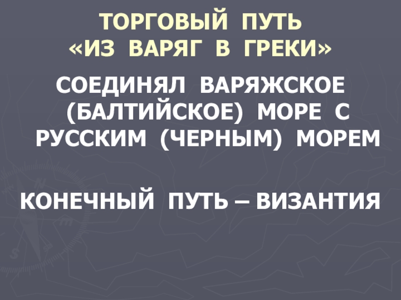 ТОРГОВЫЙ ПУТЬ  «ИЗ ВАРЯГ В ГРЕКИ»СОЕДИНЯЛ ВАРЯЖСКОЕ (БАЛТИЙСКОЕ) МОРЕ С РУССКИМ (ЧЕРНЫМ) МОРЕМКОНЕЧНЫЙ ПУТЬ – ВИЗАНТИЯ