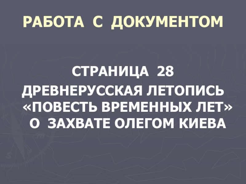 РАБОТА С ДОКУМЕНТОМСТРАНИЦА 28ДРЕВНЕРУССКАЯ ЛЕТОПИСЬ «ПОВЕСТЬ ВРЕМЕННЫХ ЛЕТ» О ЗАХВАТЕ ОЛЕГОМ КИЕВА