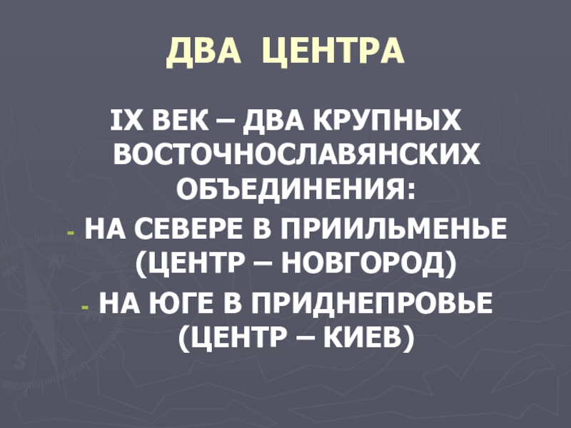 ДВА ЦЕНТРАIX ВЕК – ДВА КРУПНЫХ ВОСТОЧНОСЛАВЯНСКИХ ОБЪЕДИНЕНИЯ:НА СЕВЕРЕ В ПРИИЛЬМЕНЬЕ (ЦЕНТР – НОВГОРОД)НА ЮГЕ В ПРИДНЕПРОВЬЕ