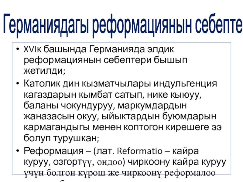 Германиядагы реформациянын себептери XVIк башында Германияда элдик реформациянын себептери бышып жетилди;Католик дин кызматчылары индульгенция кагаздарын кымбат сатып,