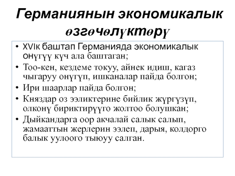 Германиянын экономикалык өзгөчѳлүктөрү XVIк баштап Германияда экономикалык онүгүү күч ала баштаган;Тоо-кен, кездеме токуу, айнек идиш, кагаз чыгаруу онүгүп, ишканалар пайда болгон;Ири шаарлар пайда болгон;Княздар оз ээликтерине бийлик жүргүзүп, олконү бириктирүүго жолтоо болушкан;Дыйкандарга оор акчалай салык салып,
