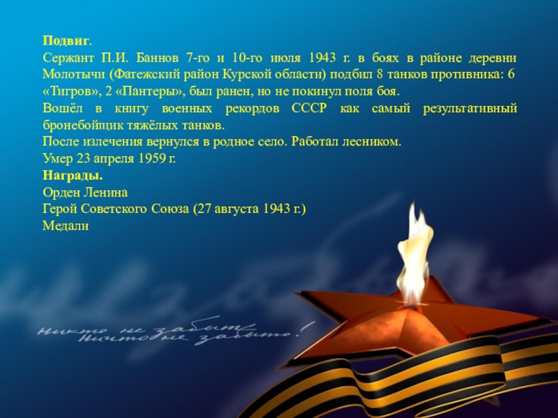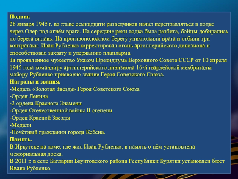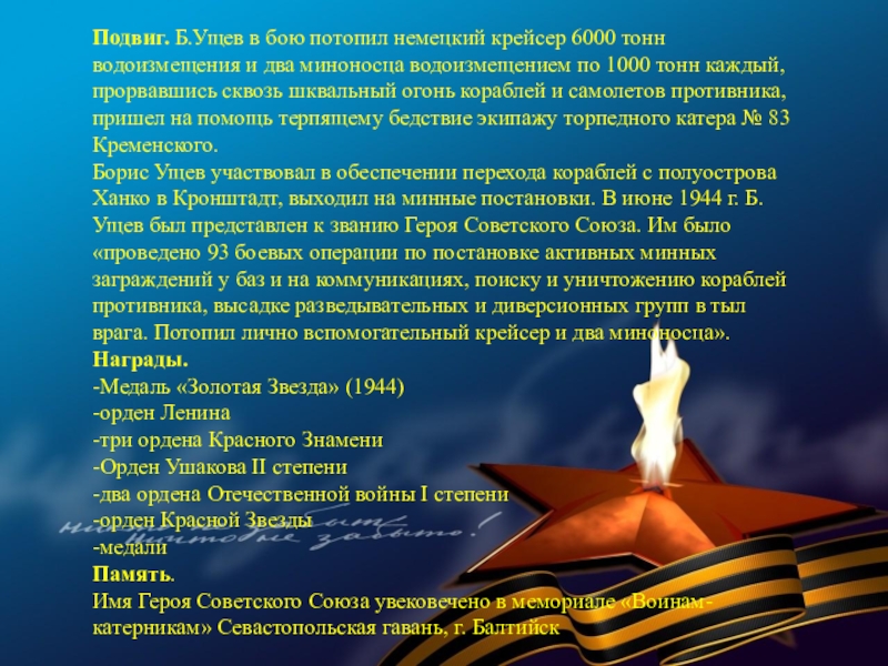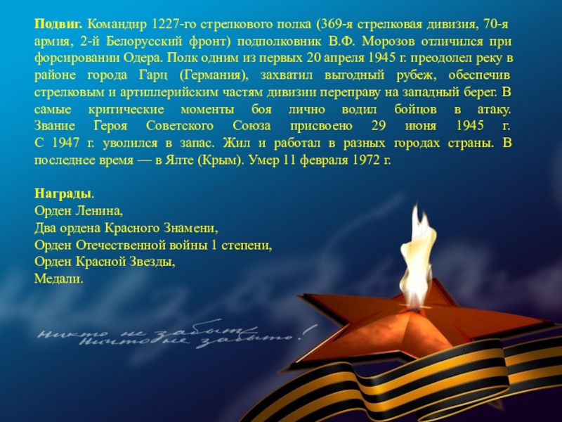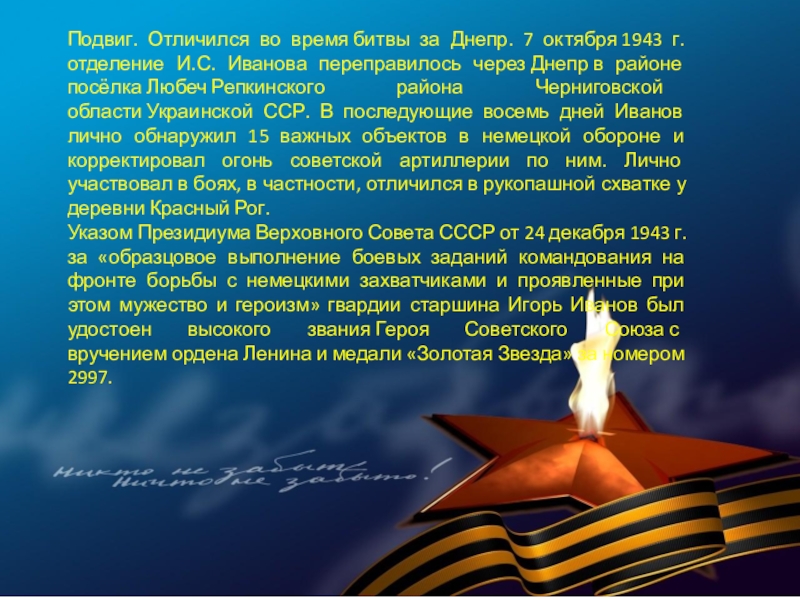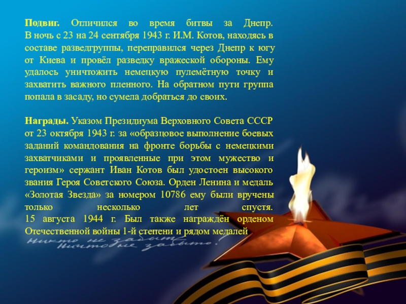 Слайд 55Подвиг. Отличился во время битвы за Днепр.