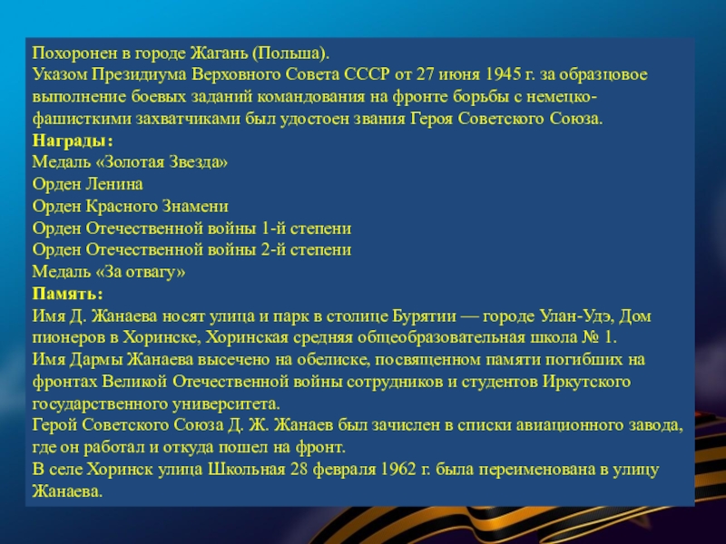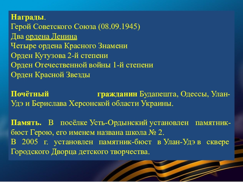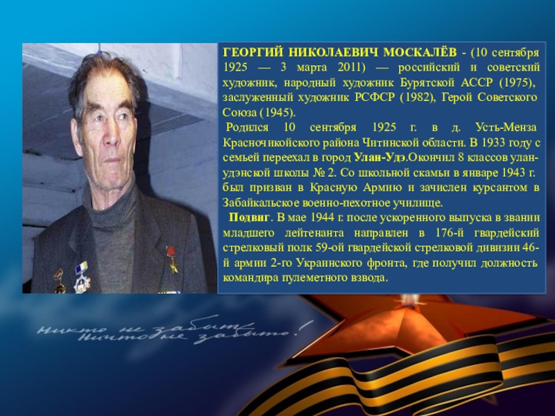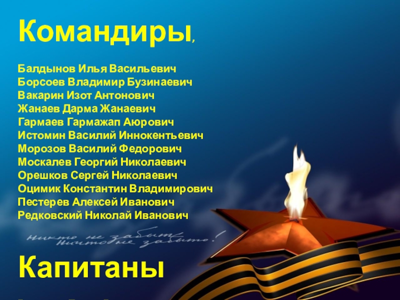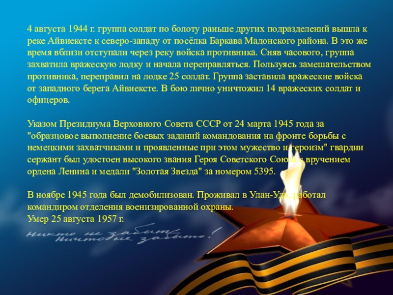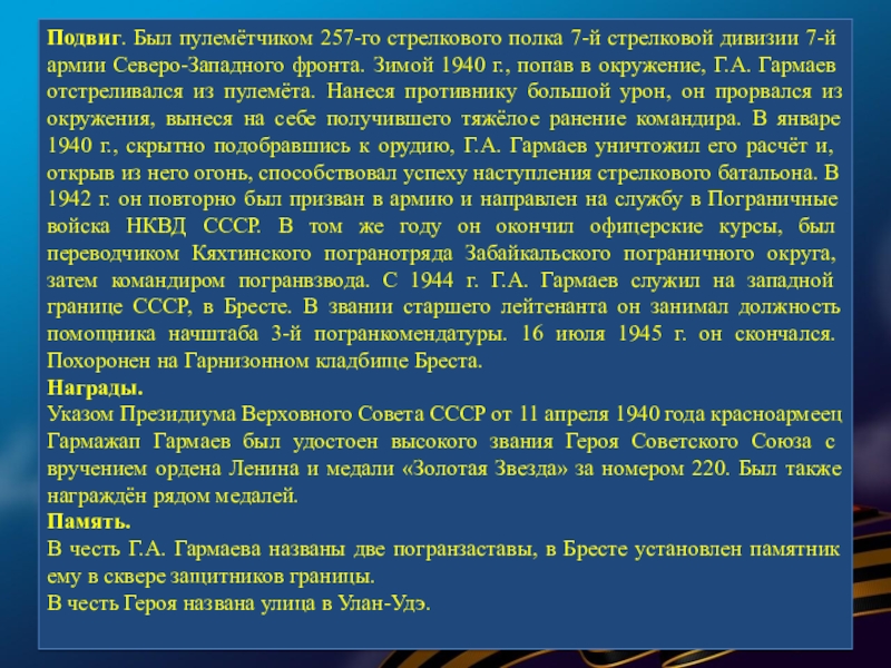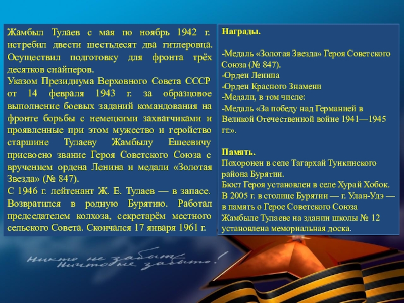 В суровые годы Великой Отечественной войны 77 580 семей республики послали на фронт более 120 тысяч человек. В кровопролитных боях они защищали Родину. Презентация, посвященная лишь некоторым героям Бурятии — это вовсе не попытка отделить их от остальных славных сынов и дочерей республики, они олицетворяют подвиг всего народа республики, в том числе и тружеников тыла.