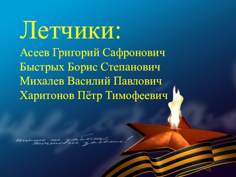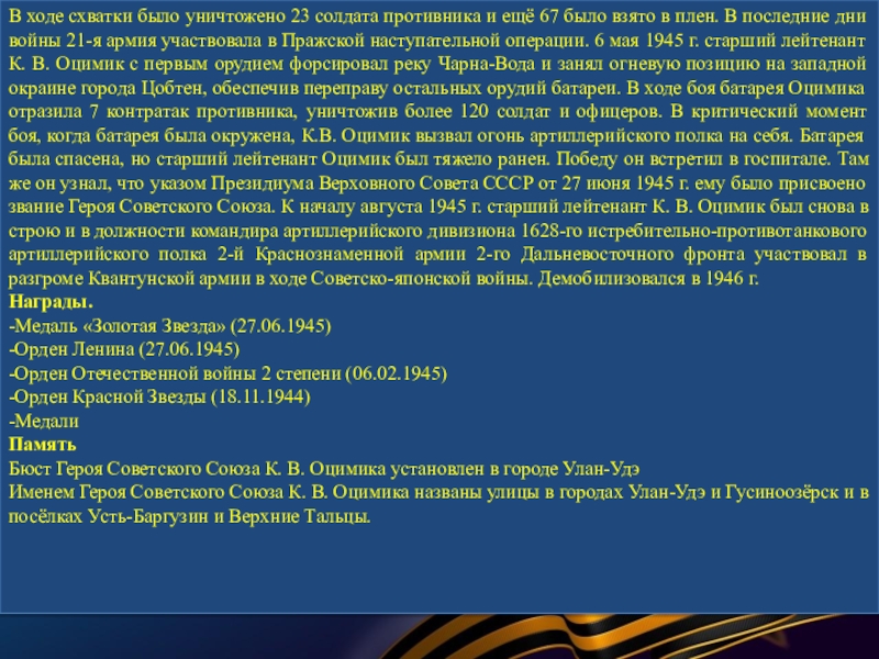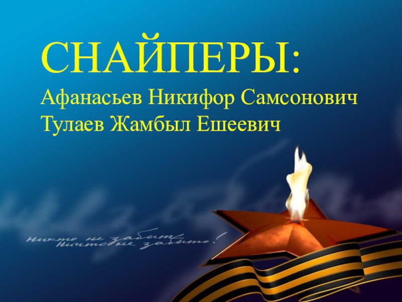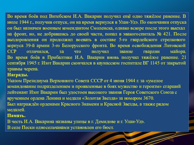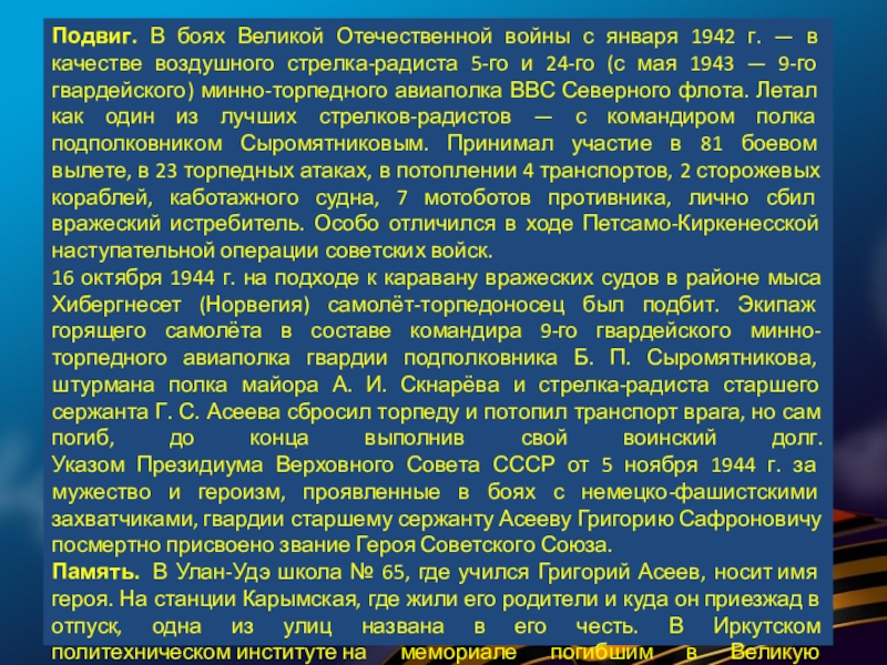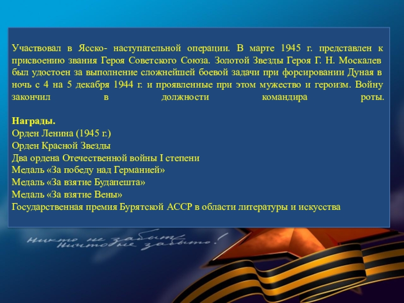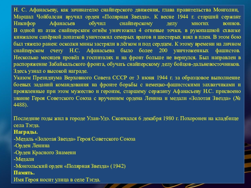 В суровые годы Великой Отечественной войны 77 580 семей республики послали на фронт более 120 тысяч человек. В кровопролитных боях они защищали Родину. Презентация, посвященная лишь некоторым героям Бурятии — это вовсе не попытка отделить их от остальных славных сынов и дочерей республики, они олицетворяют подвиг всего народа республики, в том числе и тружеников тыла.