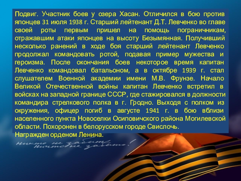 31 июля 1938 г. Старший лейтенант Д.Т. Левченко во главе своей роты первым пришел на помощь пограничникам, отражавшим атаки японцев на высоту Безымянная. Получивший несколько ранений в ходе боя старший лейтенант Левченко продолжал командовать ротой, подавая пример мужества и героизма. После окончания боев некоторое время капитан Левченко командовал батальоном, а в октябре 1939 г. стал слушателем Военной академии имени М.В. Фрунзе. Начало Великой Отечественной войны капитан Левченко встретил в войсках на западной границе СССР, где стажировался в должности командира стрелкового полка в г. Гродно. Выходя с полком из окружения, офицер погиб в августе 1941 г. в бою вблизи населенного пункта Новоселки Осиповичского района Могилевской области. Похоронен в белорусском городе Свислочь.
