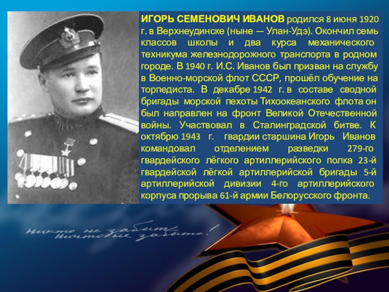 Слайд 52ИГОРЬ СЕМЕНОВИЧ ИВАНОВ родился 8 июня 1920 г. в Верхнеудинске (ныне — Улан-Удэ). Окончил