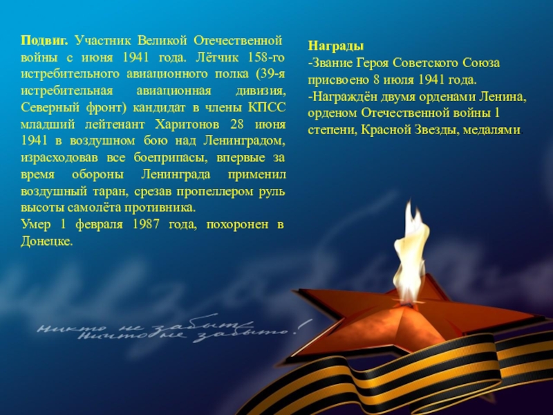 истребительного авиационного полка (39-я истребительная авиационная дивизия, Северный фронт) кандидат в члены КПСС младший лейтенант Харитонов 28 июня 1941 в воздушном бою над Ленинградом, израсходовав все боеприпасы, впервые за время обороны Ленинграда применил воздушный таран, срезав пропеллером руль высоты самолёта противника.