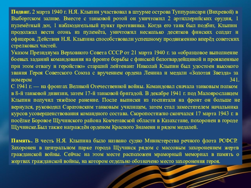 Слайд 58Подвиг. 2 марта 1940 г. Н.Я. Клыпин участвовал в штурме острова