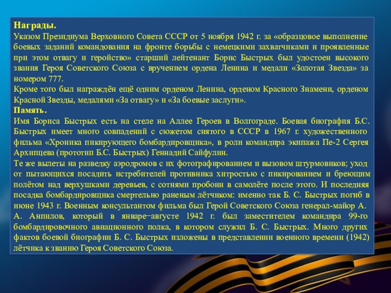 «образцовое выполнение боевых заданий командования на фронте борьбы с немецкими захватчиками и проявленные при этом отвагу и геройство» старший лейтенант Борис Быстрых был удостоен высокого звания Героя Советского Союза с вручением ордена Ленина и медали «Золотая Звезда» за номером 777.