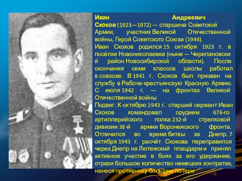 Слайд 6Иван Андреевич Скоков (1923—1972) — старшина Советской Армии, участник Великой Отечественной войны, Герой Советского Союза (1944).