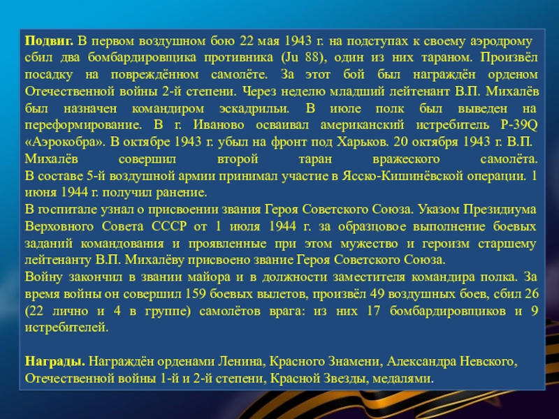 к своему аэродрому сбил два бомбардировщика противника (Ju 88), один из них тараном. Произвёл посадку на повреждённом самолёте. За этот бой был награждён орденом Отечественной войны 2-й степени. Через неделю младший лейтенант В.П. Михалёв был назначен командиром эскадрильи. В июле полк был выведен на переформирование. В г. Иваново осваивал американский истребитель P-39Q «Аэрокобра». В октябре 1943 г. убыл на фронт под Харьков. 20 октября 1943 г. В.П. Михалёв совершил второй таран вражеского самолёта.