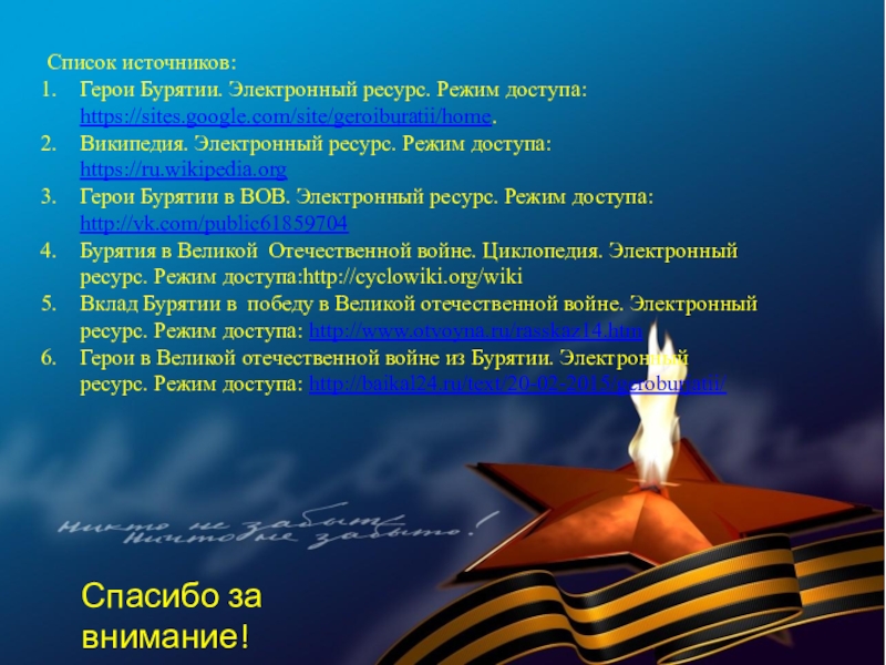 Герои в Великой отечественной войне из Бурятии. Электронный ресурс. Режим доступа: http://baikal24.ru/text/20-02-2015/geroburjatii/