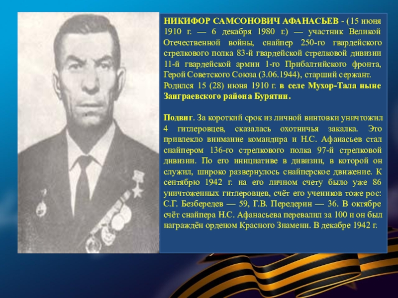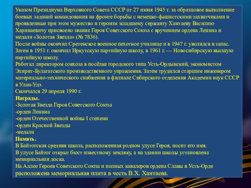 Слайд 8ВАСИЛИЙ ХАРИНАЕВИЧ ХАНТАЕВ- (19 августа 1924, улус Байтог, Эхирит-Булагатский район, Иркутская