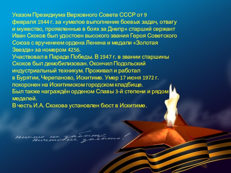 отвагу и мужество, проявленные в боях за Днепр» старший сержант Иван Скоков был удостоен высокого звания Героя Советского Союза с вручением ордена Ленина и медали «Золотая Звезда» за номером 4256.