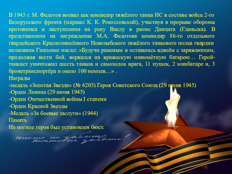 Слайд 60В 1945 г. М. Федотов воевал как командир тяжёлого танка ИС