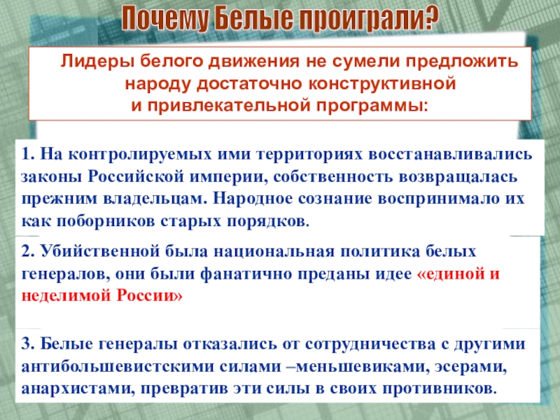 2. Убийственной была национальная политика белых генералов, они были фанатично преданы идее «единой и неделимой России»