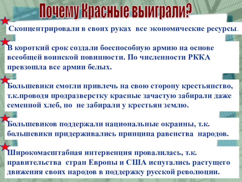 Большевики смогли привлечь на свою сторону крестьянство, т.к.проводя продразверстку красные зачастую забирали даже семенной хлеб, но не забирали у крестьян землю.