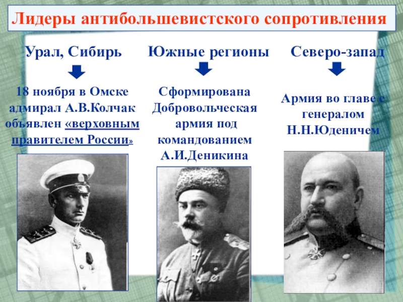 4. В самом белом движении не было единства и взаимодействия ни в политической, ни в военной области. Между лидерами существовали неприязненные личные отношения. Каждый стремился к лидерству. Провозглашение А.В.Колчака верховным правителем России было чисто формальным актом.